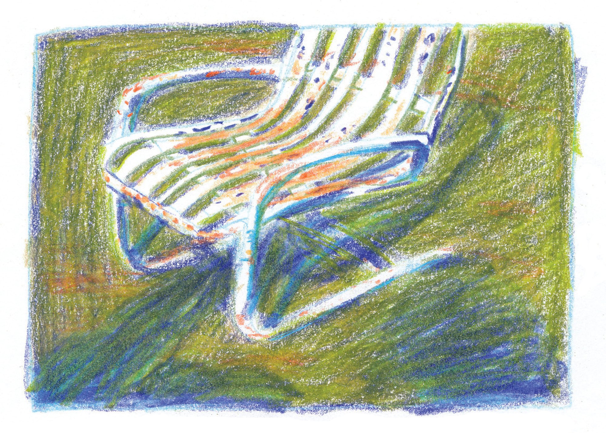 Cardstock 8.5x11 print of LAWNCHAIR by Casper Warren. The original illustration is colored pencil on paper; drawn on site in Missouri.