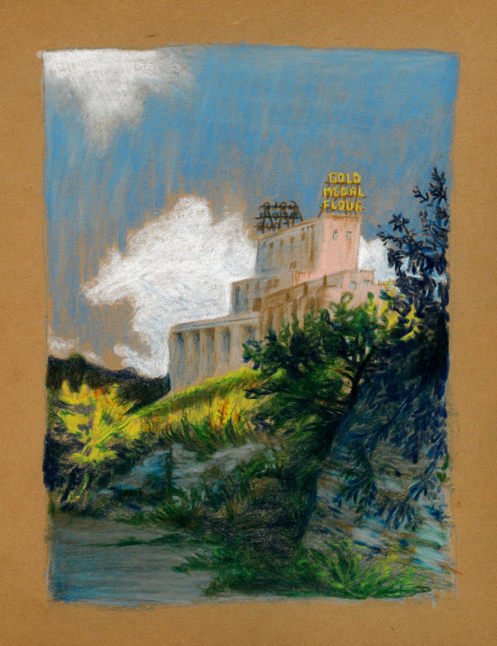 Cardstock 8.5x11 print of MILLS RUINS by Casper Warren. The original illustration is colored pencil on paper; drawn on site in the Mills Ruins Park by the Mississippi River in Minneapolis, Minnesota.